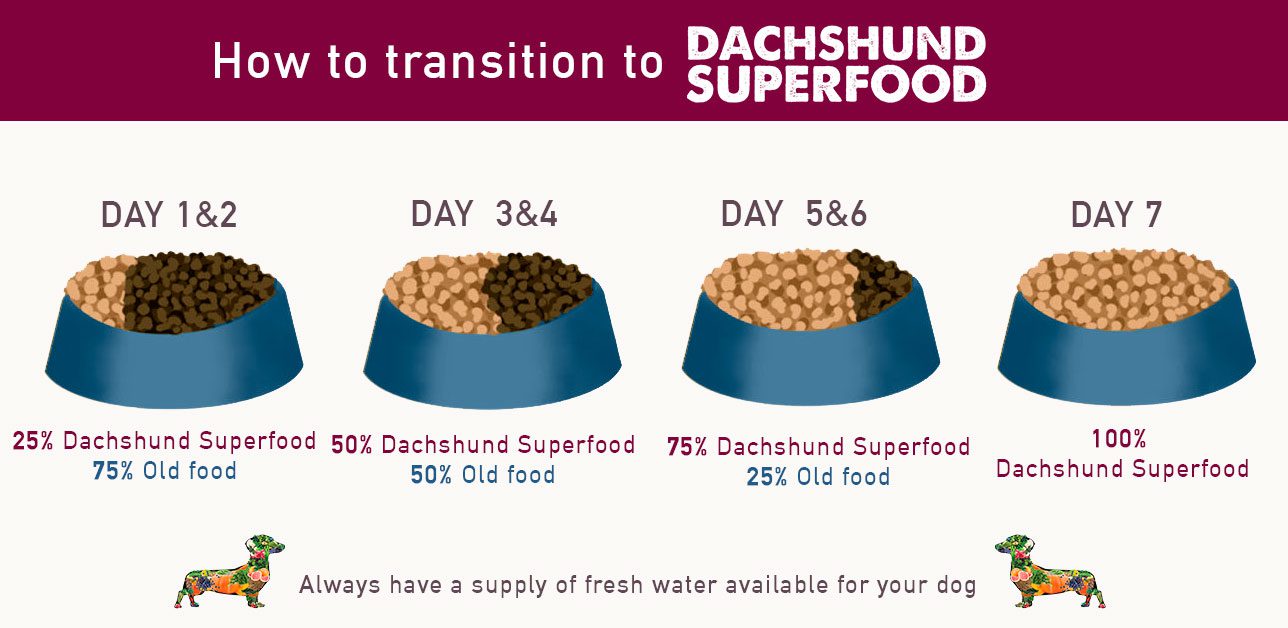 Our recipes also contain high quality freshly prepared proteins which are highly digestible for small breeds. When you decide to make the change to our nutrient rich Dachshund Superfood we would advise a gradual change and to mix in with their old food.